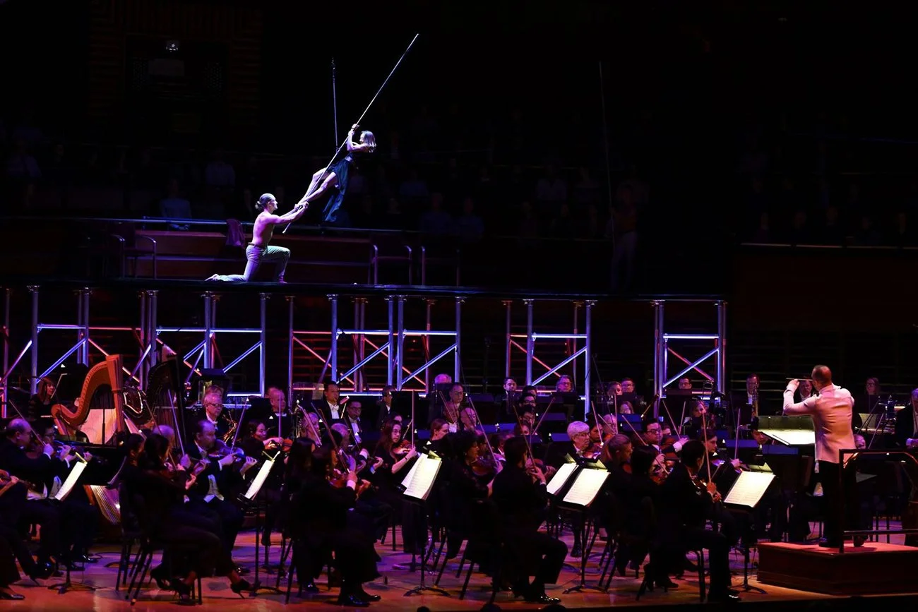 The performance’s focus alternated between the music and the movement in a way that quickly began to make sense. During “Dance of the Knights”—perhaps the best-known part of Prokofiev’s ballet—three topless male dancers mounted silver trapezes that looked like inverted swords. Standing on the hilts of the “swords,” they circled in the air above the orchestra. Next, the middle trapeze was inverted so that it looked like a cross. A female dancer in a black dress looped her arms over the sides and spun into the air. This image of crucifixion provided a fitting foreshadowing of Juliet’s doom.